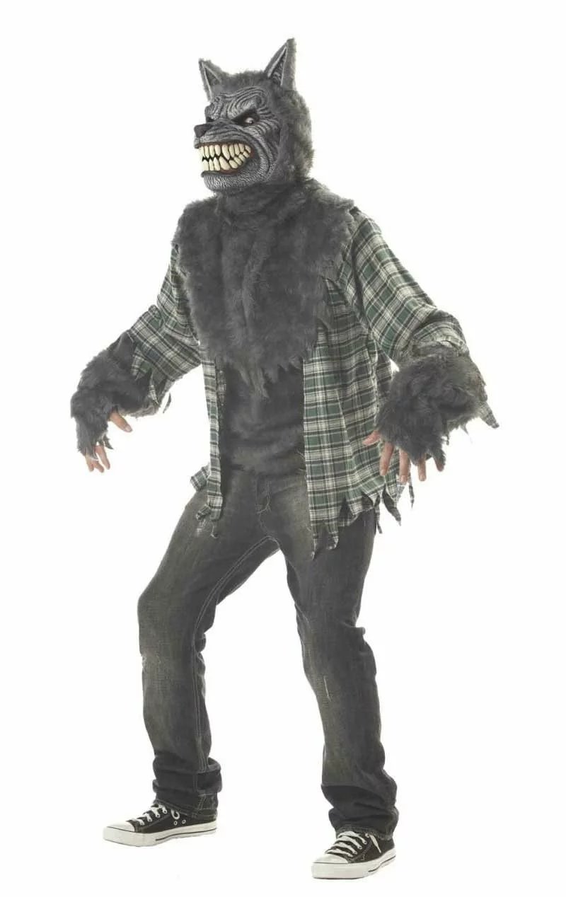 Check the moon and the time in the fierce Adult Full Moon Madness Wolf Halloween Costume! The costume includes a checked shirt with jagged edges plus fur and animation mask.