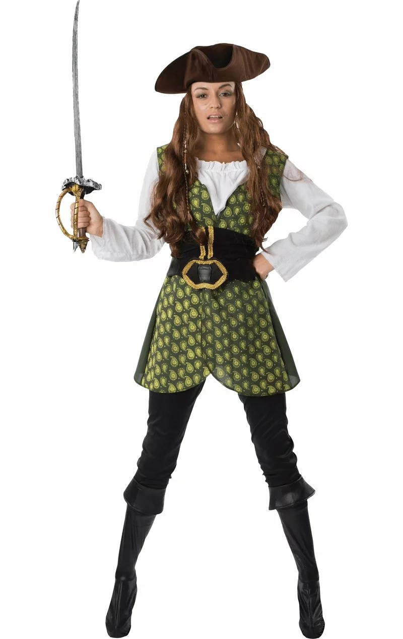 Spy land in the Adult Matey Pirate Costume! The costume includes top, trousers, waistcoat, waspie, belt, boot toppers, and hat.