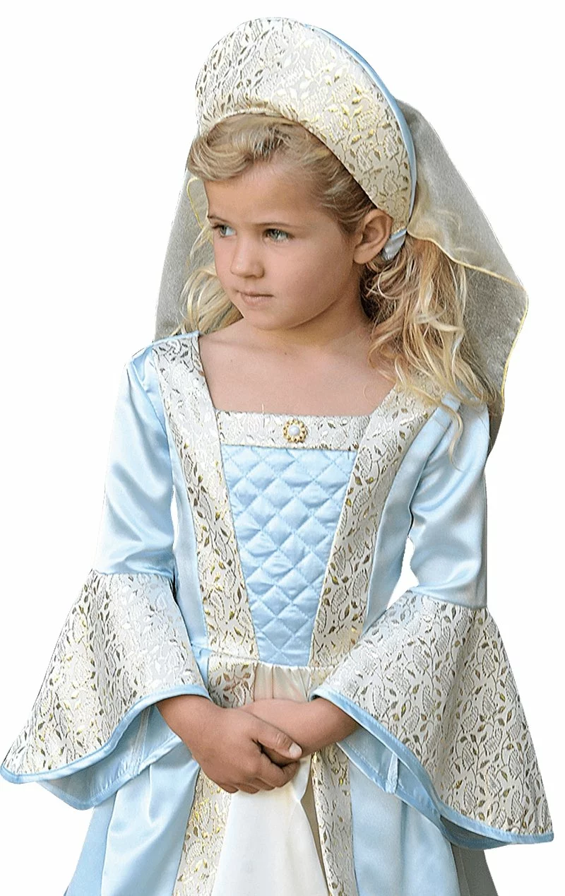 Bring history to life for your little one with our child’s Tudor Girl costume, featuring a powder blue gown and matching veiled headpiece.