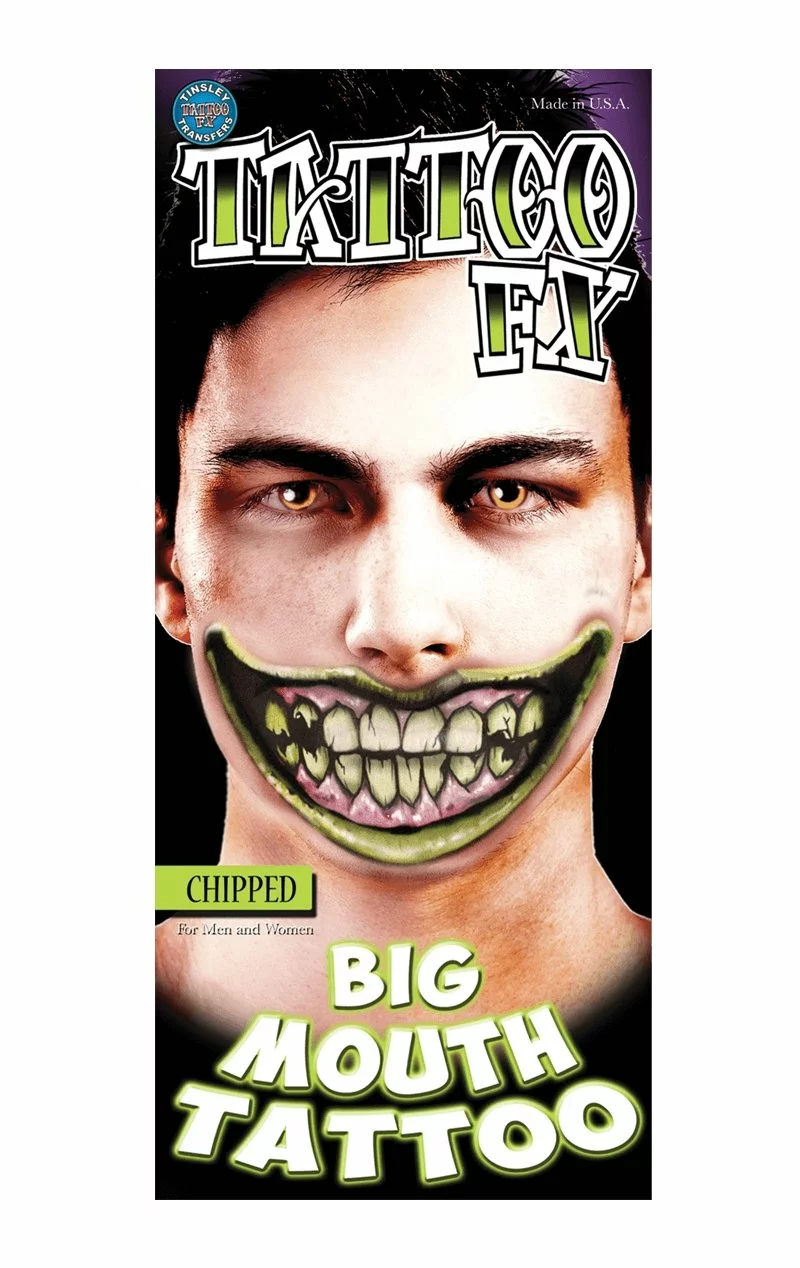 The Chipped Big Mouth Temporary Tattoo is a high quality, long lasting tattoo that has been created by professional Hollywood make-up artists. You don’t need to use messy glues!