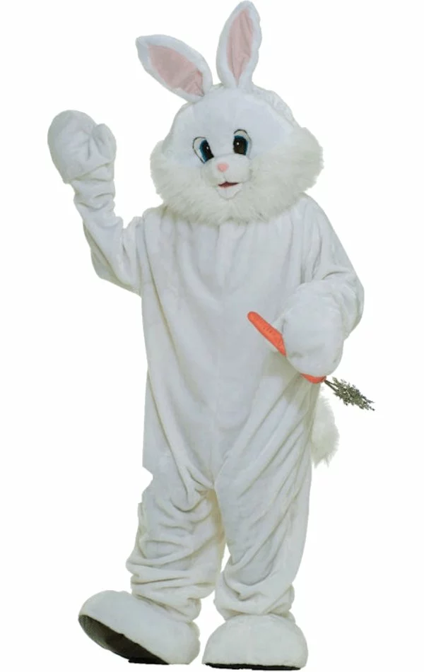 Hop around for your favourite sports team in the Adult Deluxe Plush Bunny Rabbit Mascot Costume! The costume includes a white headpiece plus jumpsuit with attached hands and foot covers