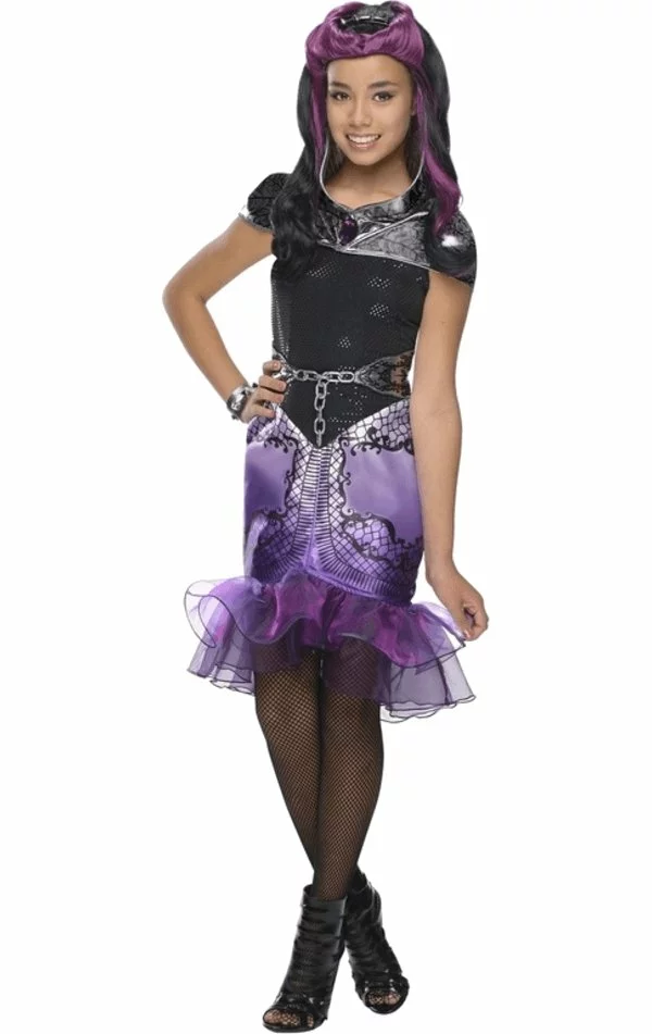 Look gothic in the Child Ever After High Raven Queen Costume! This costume includes a capelet, dress, belt, cuff and tights.