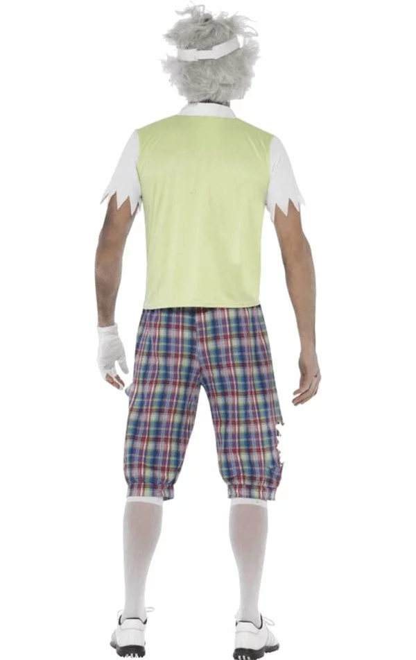 Our Zombie Golfer costume includes a blood spattered green gingham top with white sleeves and bow-tie and an open latex golf ball wound to the chest. A bloody white glove, visor and tattered shorts are also included. Why not add some facepaint to enhance your scary zombie look. This is a great costume for a Halloween party or a gruesome round of pub golf.