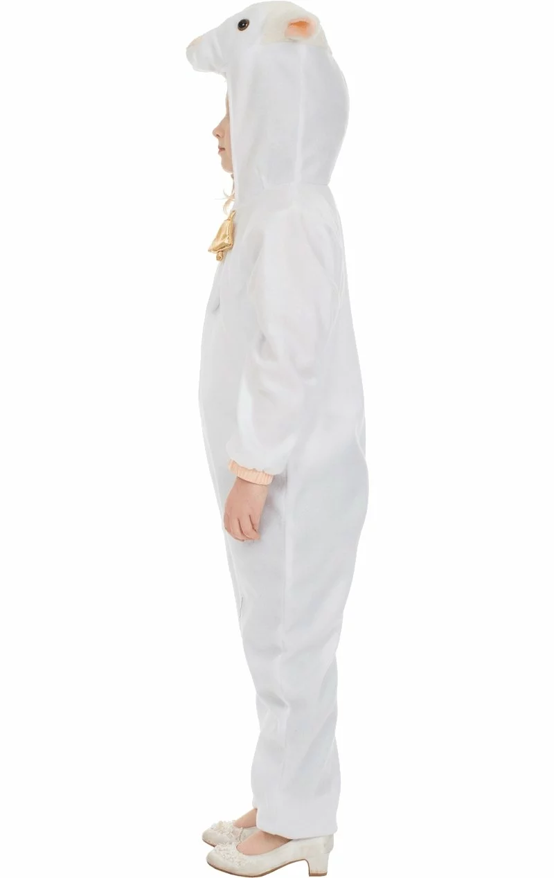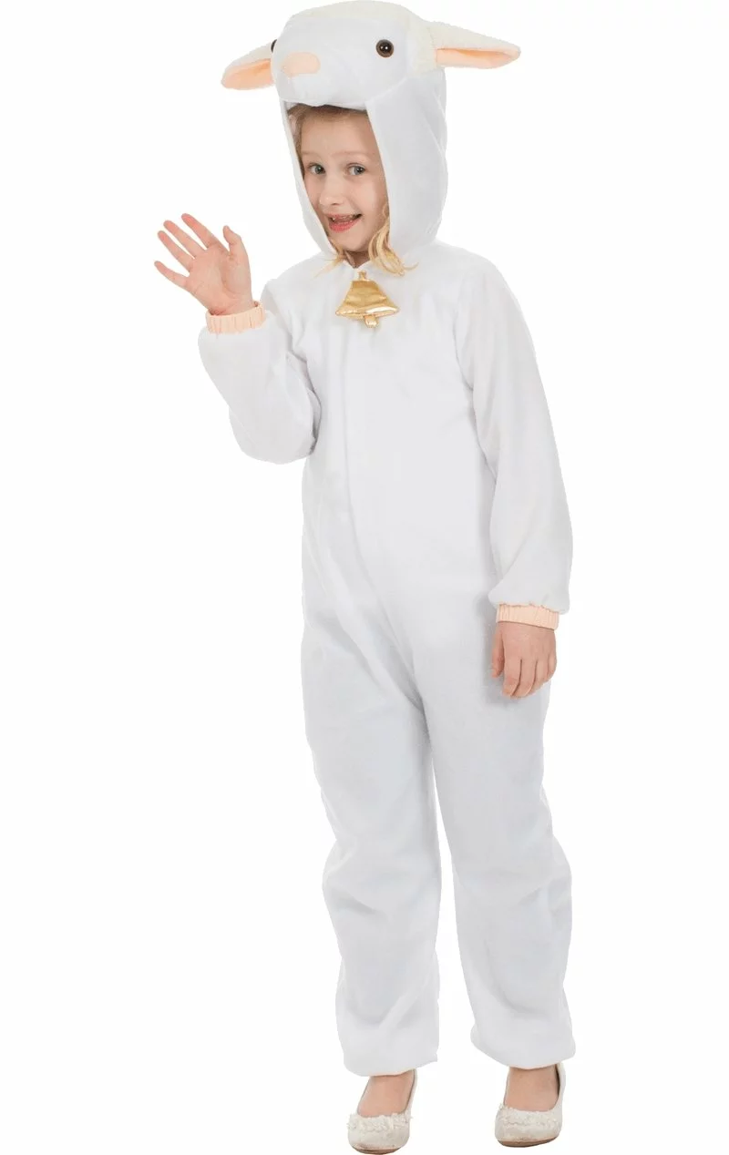 The Kids Woolly Lamb Costume consists of an all-in-one white fleece jumpsuit. The outfit features a cute little gold bell on the front, pale pink detailing on the sleeves, and finally, a lamb hood that’s attached to the jumpsuit.
