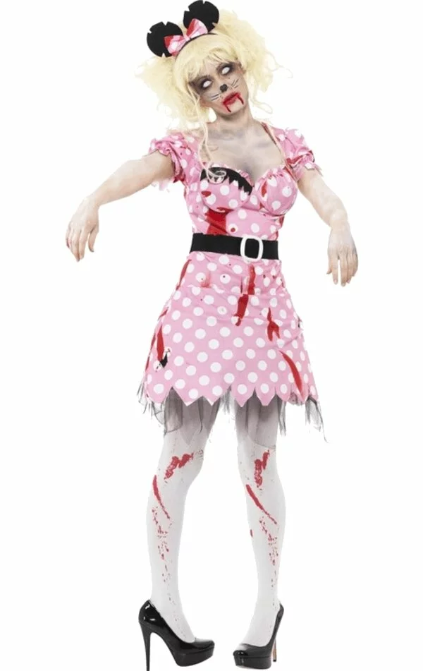 Become the scariest cartoon ever with the Adult Zombie Mouse Costume! This costume includes a dress, belt and headband.