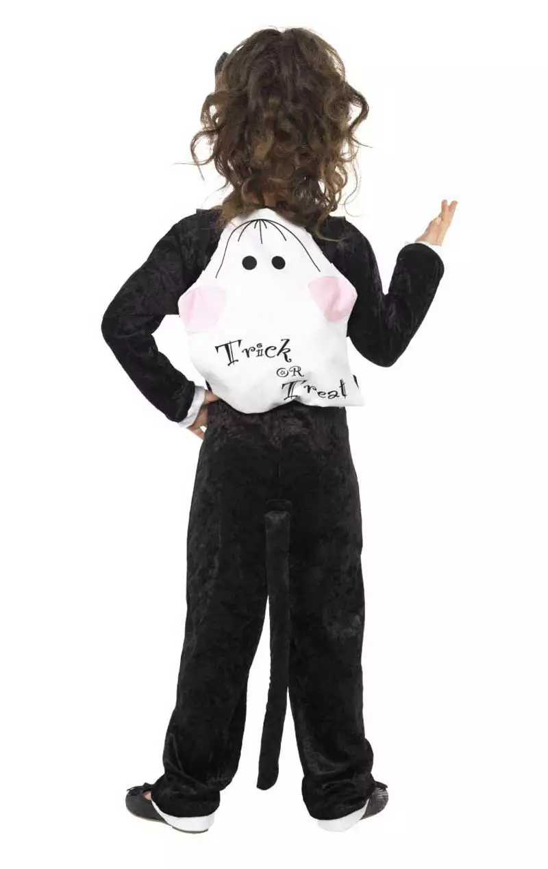 The Children’s Black Cat Costume includes a tactile black and white jumpsuit with an attached long tail and a gold bell on the collar to warn birds that she is coming. Obviously, every cat needs whiskers so we have also included a cute black mask with ears, whiskers and a little pink nose.