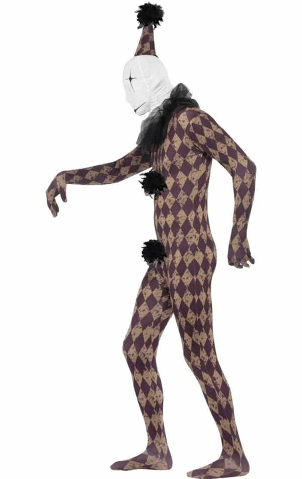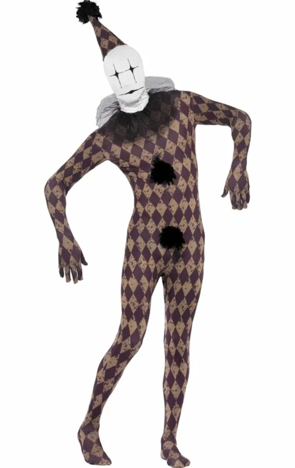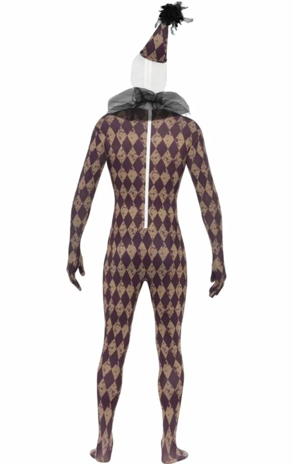 Clown around this Halloween with the Adult Twisted Harleskin Second Skin Suit! This suit comes as a second skin suit with ruff, hat and bum bag.