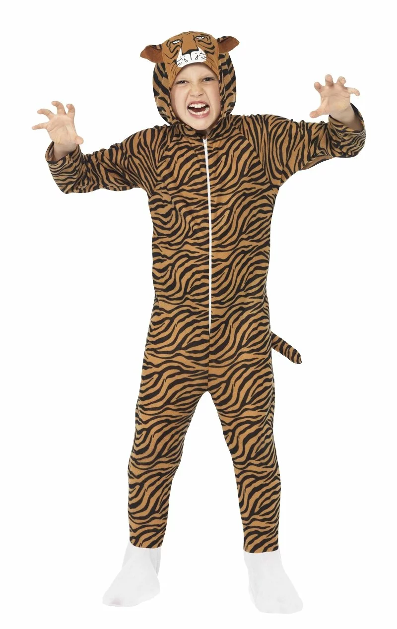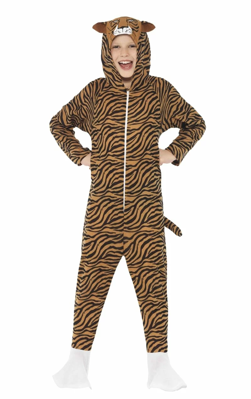The Kids Tiger Jumpsuit Costume is made up of an all-in-one tiger striped onesie with attached tail. It also features a hood containing the tigers’ ears and face, creating a simple yet effective look that’s easy to wear.