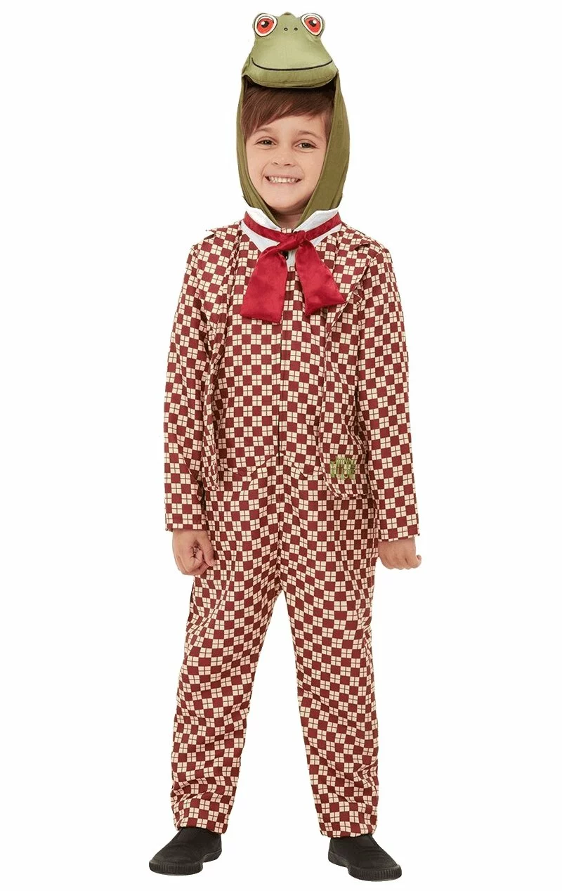 The Kids Toad Wind In The Willows Costume includes a hooded bodysuit, designed to look like a racing suit. The attached hood pulls over the head to depict the smiling face of Mr Toad himself.