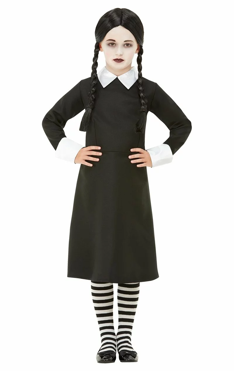 Probably the most recognisable of all young film characters, this classic costume includes a knee length black dress with white Peter-Pan collar and a black plaited wig.Β To recreate the finished look, add a pair of stripped tights and some white face paint for a deathly pallor.