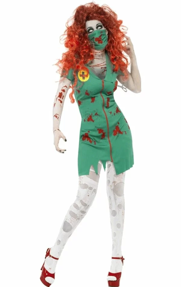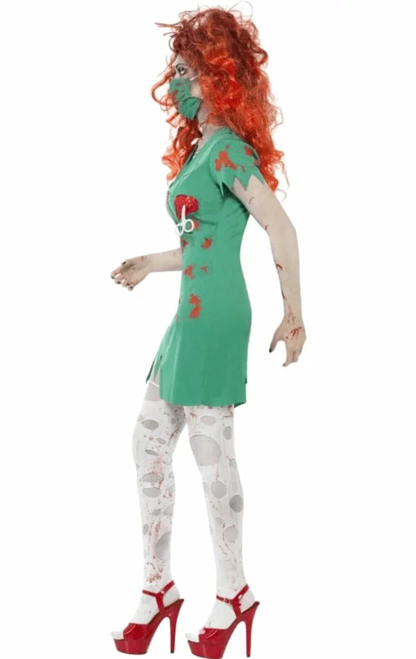 Save yourself in the Women’s Zombie Paramedic Costume! This costume includes a green dress with blood stains and a face mask.