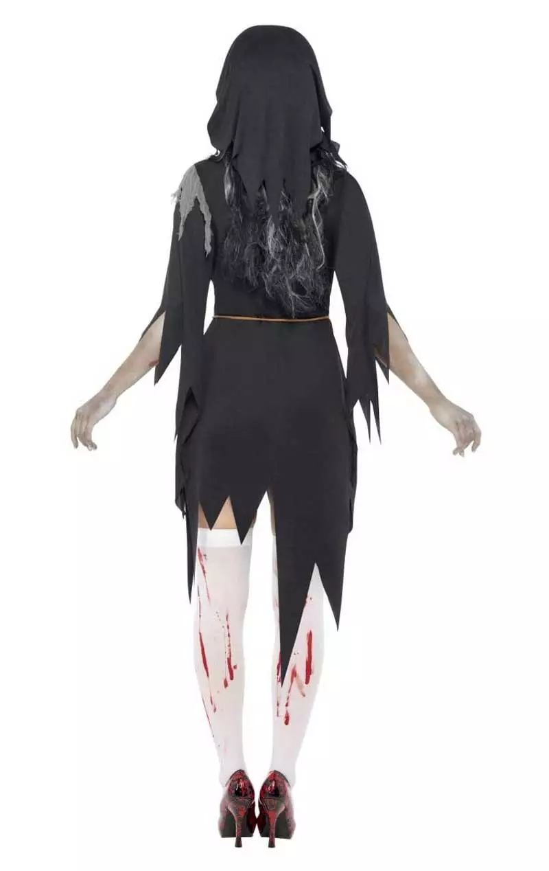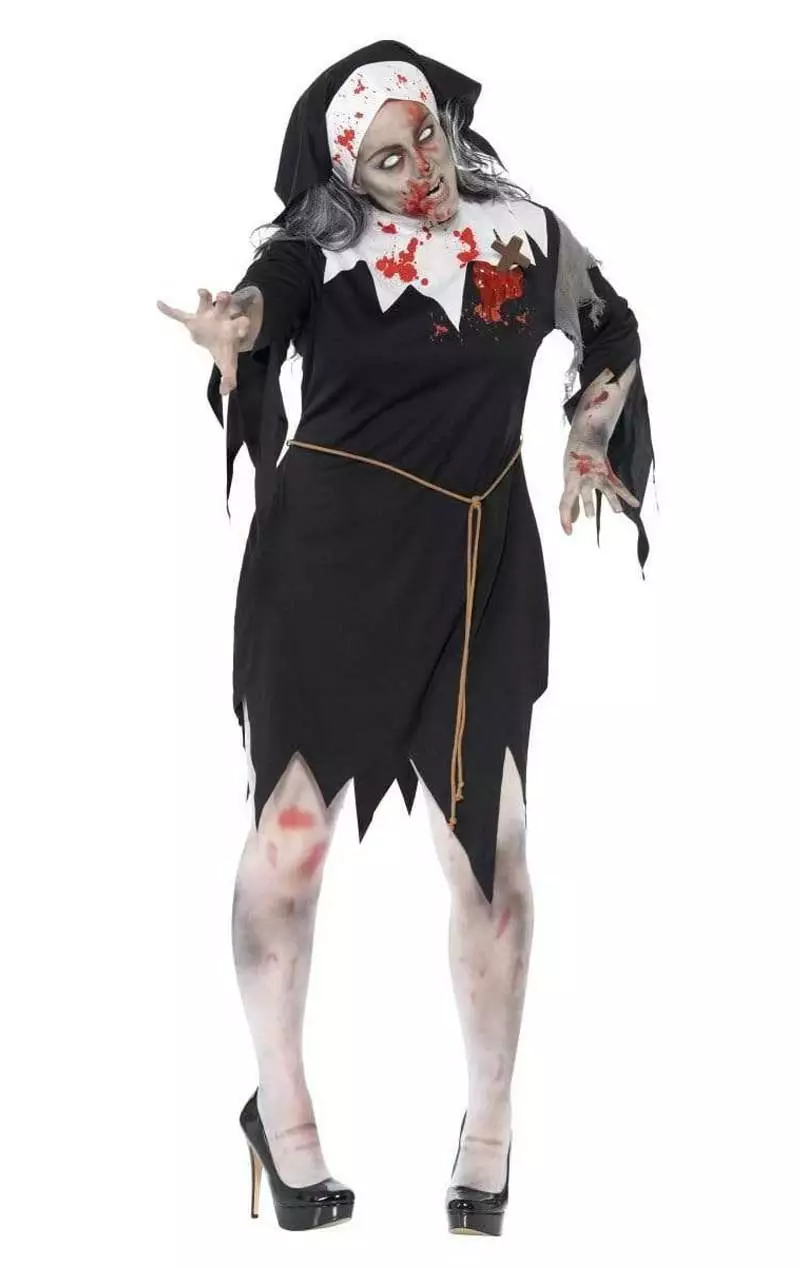 The zombie nun costume includes a black, white and grey dress that looks like you have just been summoned as a creature of the living dead. It is completed with a rope belt thatβs typical of nun outfits.