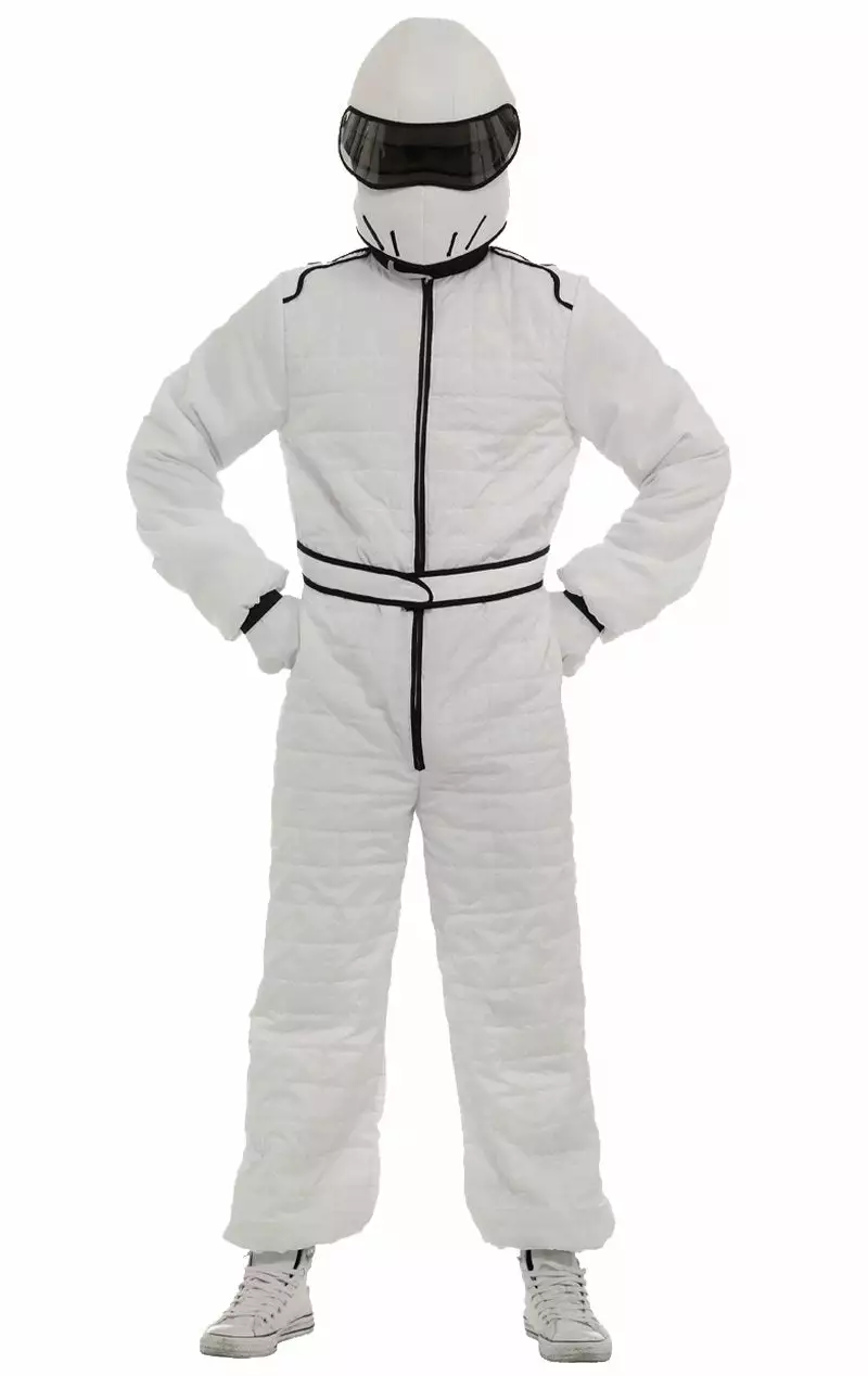 Race around the party track in the Adult White Race Suit and Helmet! The costume includes a white jumpsuit with black detailing, white gloves and headpiece.