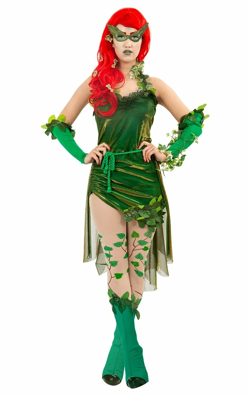 The Womens Poison Ivy Costume comes complete with a stunning, shimmering green dress, featuring a halter-neck strap and intricate faux leaf detailing. The dress is shorter at the front, and gradually gets longer towards the back. It’s finished off with a bright green belt to tie around the waist. Also included is a pair of translucent tights with leaf detailing going up the legs, a pair of bright green gauntlets, also with leaf detailing, matching boot covers, and last but not least, a green eye piece to help maintain your sultry and sexy look.